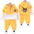 – Hanorac cu glugă și fermoar, confecționat dintr-un material extrem de moale, cu căptușeală călduroasă, într-o nuanță intensă de galben. Modelul are o parte frontală contrastantă, albă, sub forma unui buzunar mare cu clapetă, care adaugă un accent interesant și modern. Partea superioară se închide cu un fermoar scurt pentru o îmbrăcare mai ușoară. Gluga oferă un plus de confort, iar imprimeul drăguț cu ursuleț și inscripția din față completează look-ul cu o notă jucăușă și copilăroasă. Mânecele se termină cu manșete elastice fine pentru o potrivire mai bună.