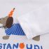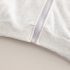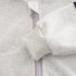 Hanorac din material moale, melanj, în gri, cu glugă, două buzunare și închidere completă cu fermoar și protecție. Accentele includ benzi colorate pe mâneci și o emblemă cusută pe o parte.