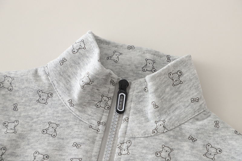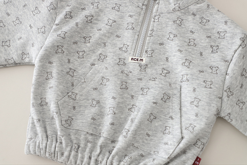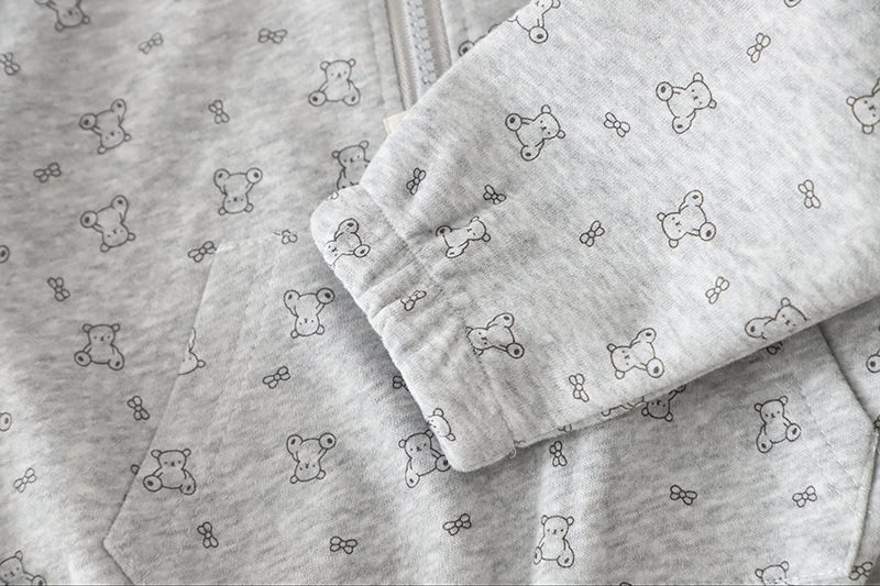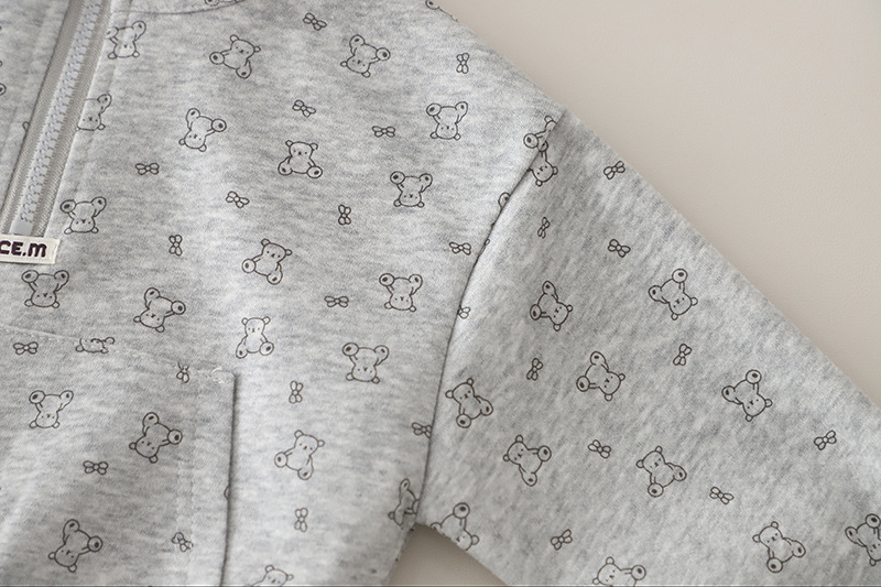 – Hanorac cu guler înalt și fermoar, confecționat dintr-un material moale și plăcut la atingere, din bumbac, de culoare gri deschis. Modelul are un imprimeu integral cu ursuleți mici, care oferă un caracter jucăuș și copilăresc. Închiderea cu fermoar în față face îmbrăcarea ușoară și comodă, iar mânecile se termină cu manșete elastice fine pentru o potrivire mai bună.