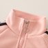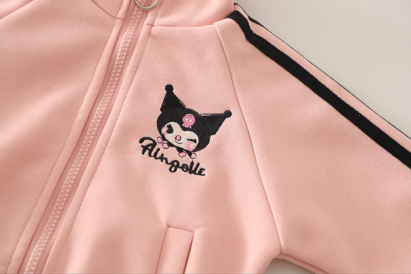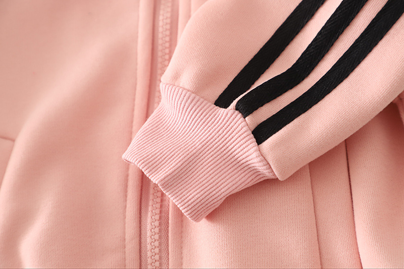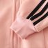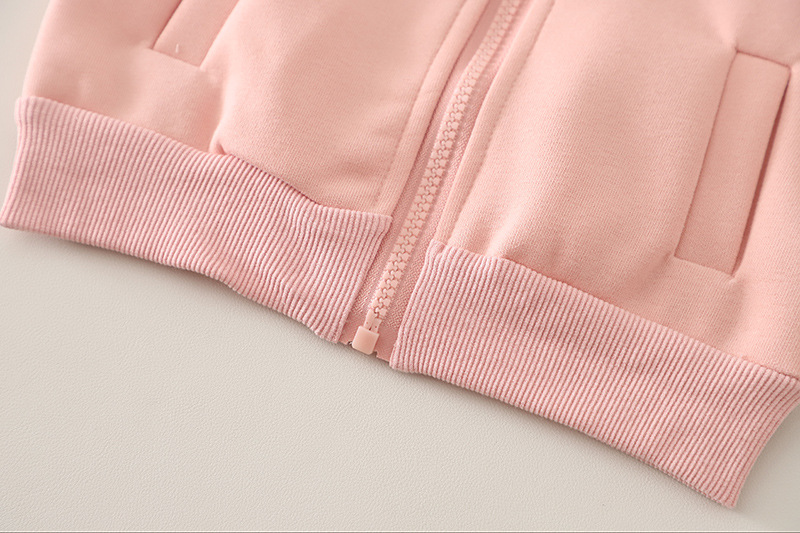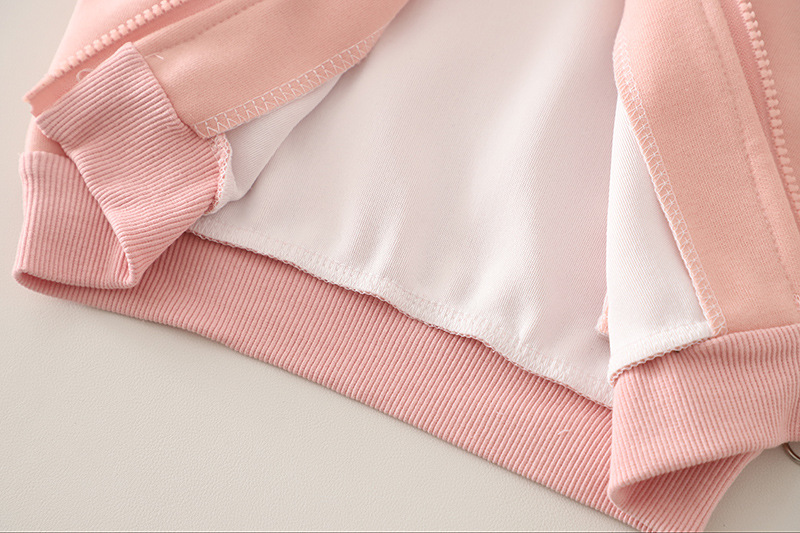 – Hanorac cu fermoar și guler înalt, confecționat din material dens pe bază de bumbac, în culoare roz. Modelul este într-o nuanță proaspătă de lavandă, cu bandă laterală contrastantă neagră pe mâneci și manșete ripsate pentru o potrivire bună. Accentele sunt reprezentate de aplicația mică cu personaj animat și inscripția din față, precum și de buzunarele frontale funcționale.