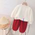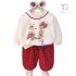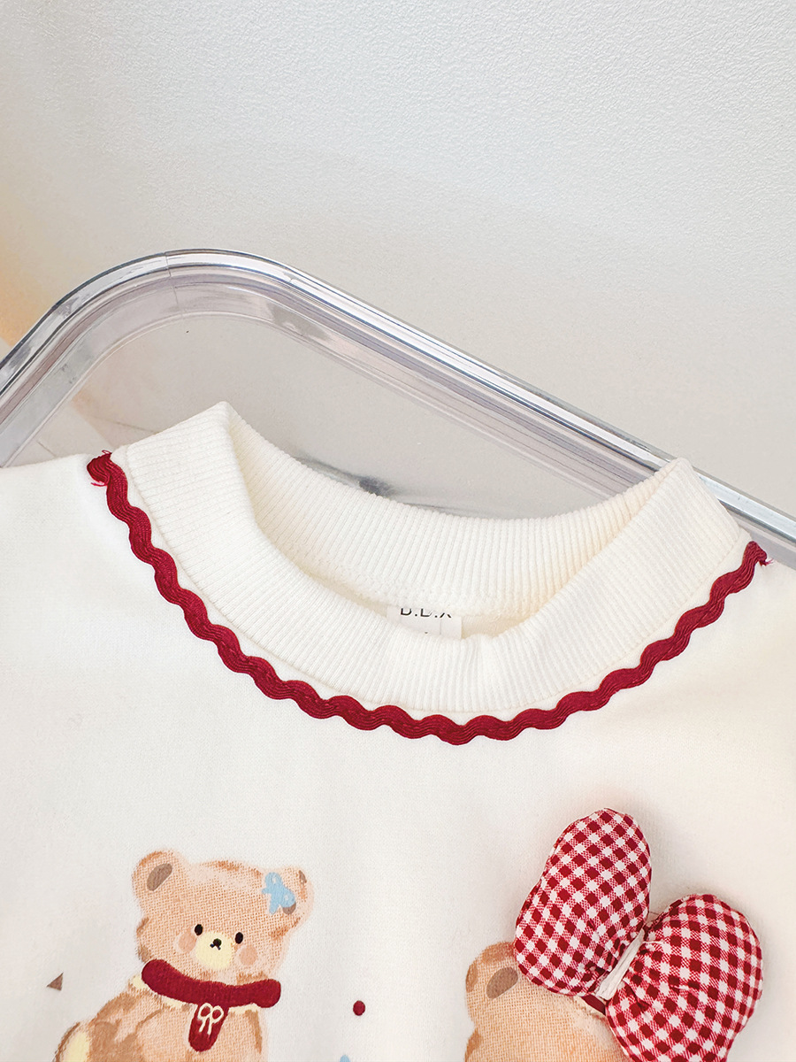 – Bluză/hanorac din bumbac, care oferă confort pe tot parcursul zilei. În culoare principală ecru, cu croială clasică, lejeră și mâneci lungi cu manșete elastice. Decorat cu imprimeuri cu ursuleți și elemente 3D – o fundiță pe gâtul unuia dintre ursuleți și o fundiță roșie aplicată, cu buline albe. Marginea contrastantă roșie de la guler completează perfect look-ul.