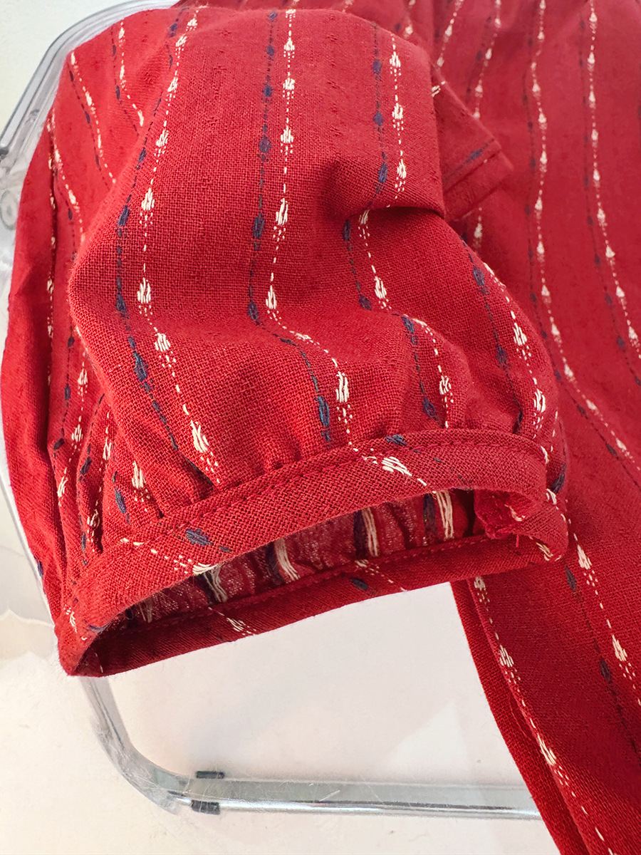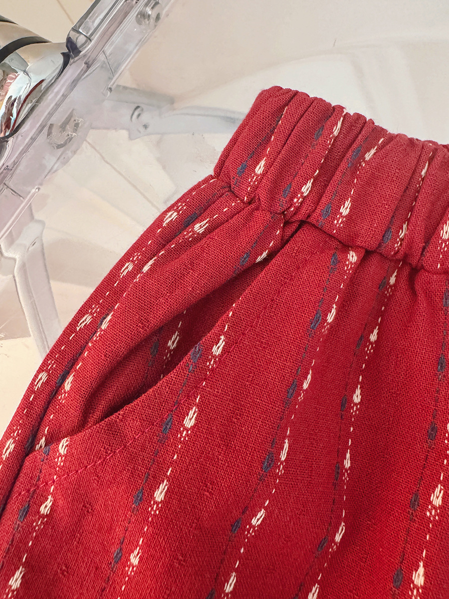 – Pantaloni din material gros, de calitate superioară, în culoare roșie, cu un model fin pe verticală. Croială tip „balon”, cu craci largi, elastic în talie și la tiv – pentru o potrivire mai bună.
