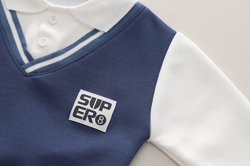– Bluziță cu guler clasic și mânecă lungă, confecționată dintr-un material moale și confortabil, care se potrivește perfect cu celelalte piese ale setului. Modelul este într-o clasică combinație alb-albastru, decorat cu un decolteu în V, linii contrastante și o imprimare „SUPER”, care adaugă un stil modern, urban. Sunt adăugate două nasturi pentru o îmbrăcare ușoară.
