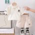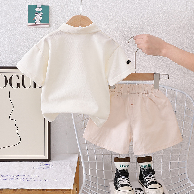 -Pantaloni scurți bej, cu croială dreaptă, din material ușor și plăcut la atingere, cu textură delicată ce combină spiritul sportiv cu eleganța clasică. Talia elastică oferă confort și libertate de mișcare, iar buzunarele frontale și o etichetă cu ursuleț în partea de jos creează un echilibru vizual cu bluza.