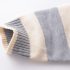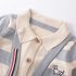 – Vestă tricotată, într-o combinație de bej deschis și gri deschis. Are guler clasic și cămașă cusută dedesubt, ceea ce creează un efect rafinat, stratificat, fără a fi nevoie de suprapuneri suplimentare. Partea superioară este decorată cu dungi late, orizontale și o broderie delicată cu un cățeluș. Se închide cu nasturi în față, iar marginea este accentuată cu linii subțiri roșu-albastre pentru un finisaj mai elegant. Manșetele sunt dense și elastice, oferind confort și căldură.