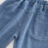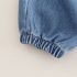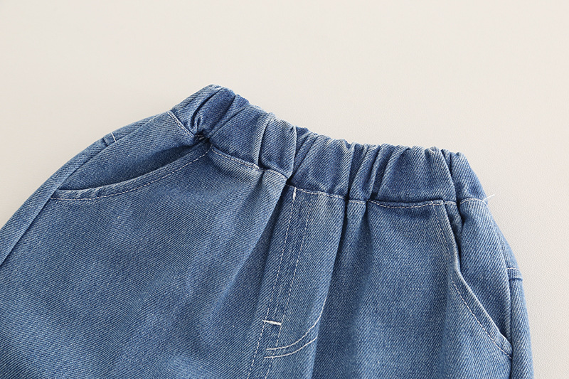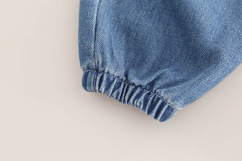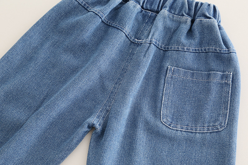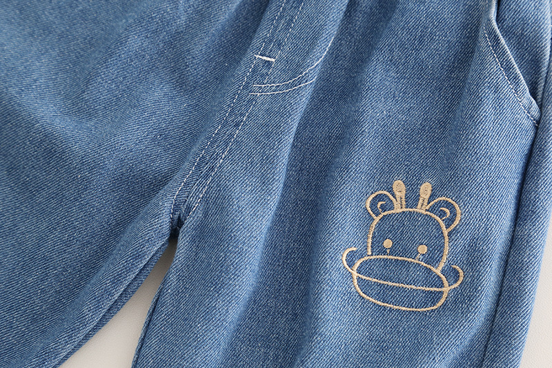–Pantaloni din denim cu croială lejeră, în nuanță albastru mediu, cu talie elastică și manșete la gleznă, cu broderie mică frontală pentru un accent animalier care completează tema.