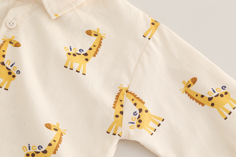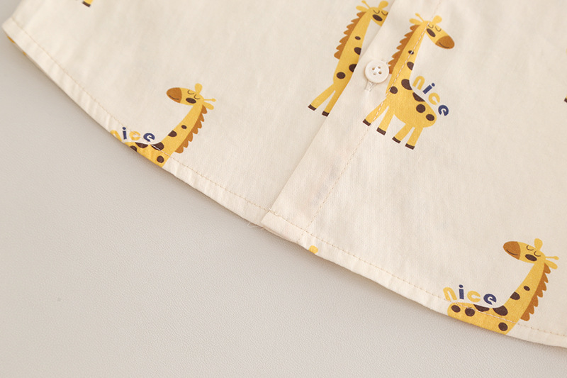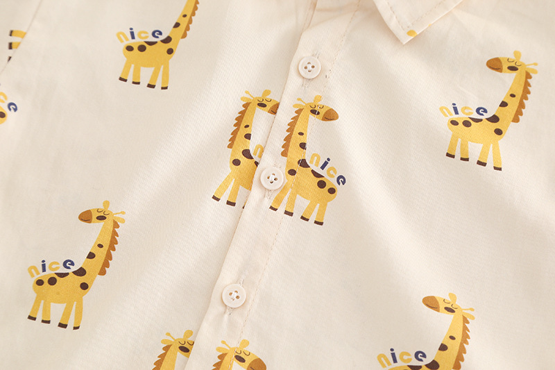 –Cămașă din bumbac crem cu imprimeu integral de girafe – în același stil ca aplicația de pe vestă, model cu guler clasic, nasturi frontal și mâneci lungi care pot fi suflecate.