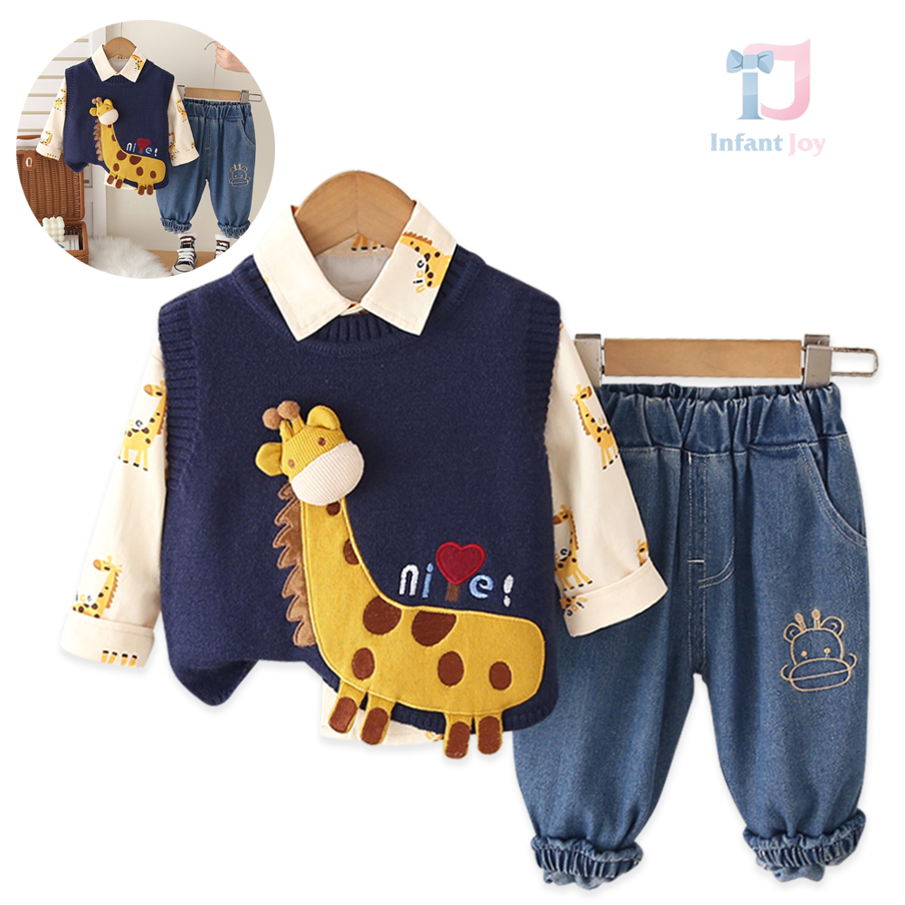 Set sport-elegant premium de 3 piese cu vestă cu elemente 3D, cămașă și pantaloni din denim Giraffe Vibes