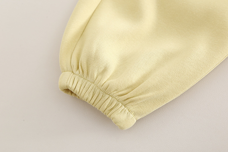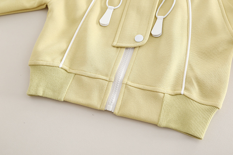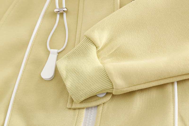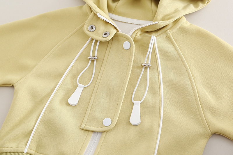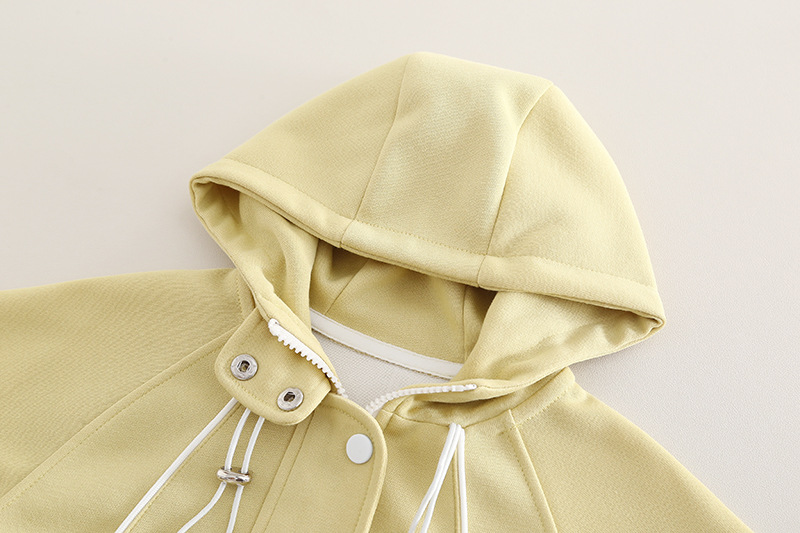 – Hanorac cu glugă, într-o nuanță galben deschis, confecționat din tricot moale și gros. Modelul are închidere dublă – fermoar funcțional și capse albe suplimentare. Șnururile și detaliile albe oferă un aspect modern, aproape „techno“. Mâneci cu manșete elastice pentru confort sporit.