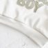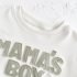 – Hanorac crem, din material de înaltă calitate, rezistent., cu guler rotund și mâneci lungi. Două capse tip tic-tac pe umăr – pentru îmbrăcare ușoară, manșete și tiv rib – pentru o fixare sigură. Aplicație centrală “MAMA’S BOY” cu relief discret și atractiv.