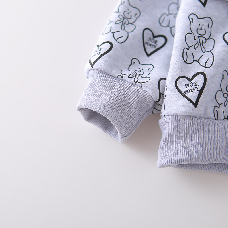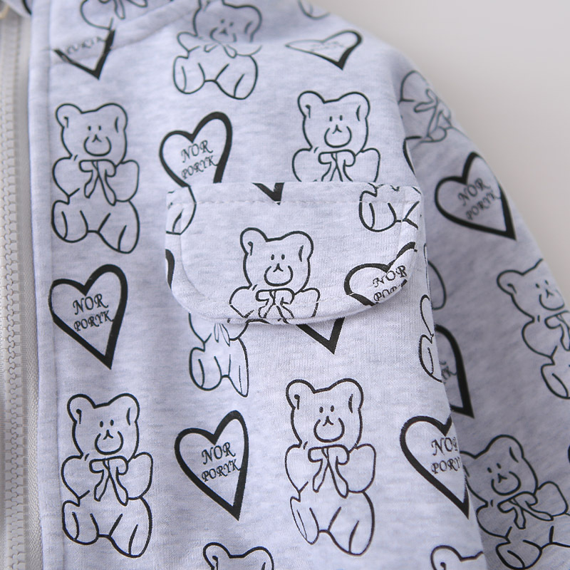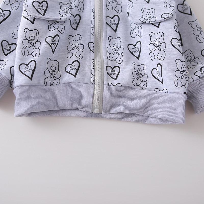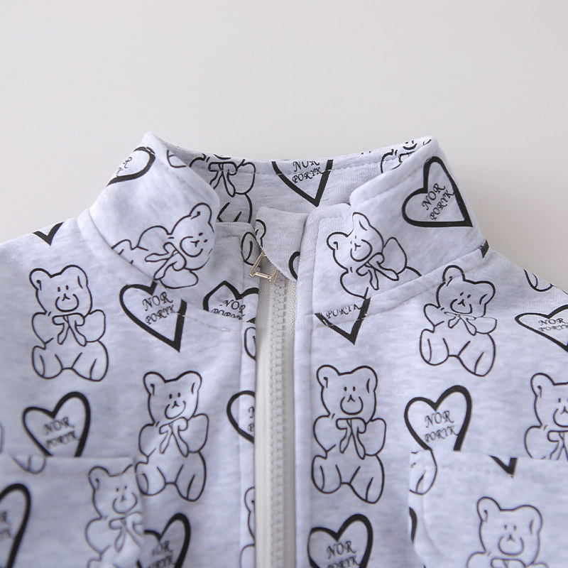 -Hanorac cu fermoar și guler înalt, confecționat din material din bumbac confortabil, în gri deschis. Partea superioară este acoperită cu imprimeuri jucăușe cu ursuleți și inimioare, care aduc o notă veselă. Gulerul înalt oferă protecție în zilele mai răcoroase, iar manșetele din rib și tivul elastic adaugă confort și un aspect finisat. Decorat cu două buzunare cu clapete în față pentru mai mult stil.