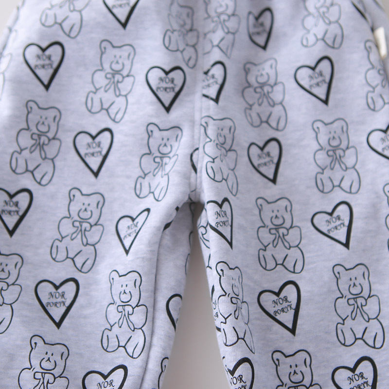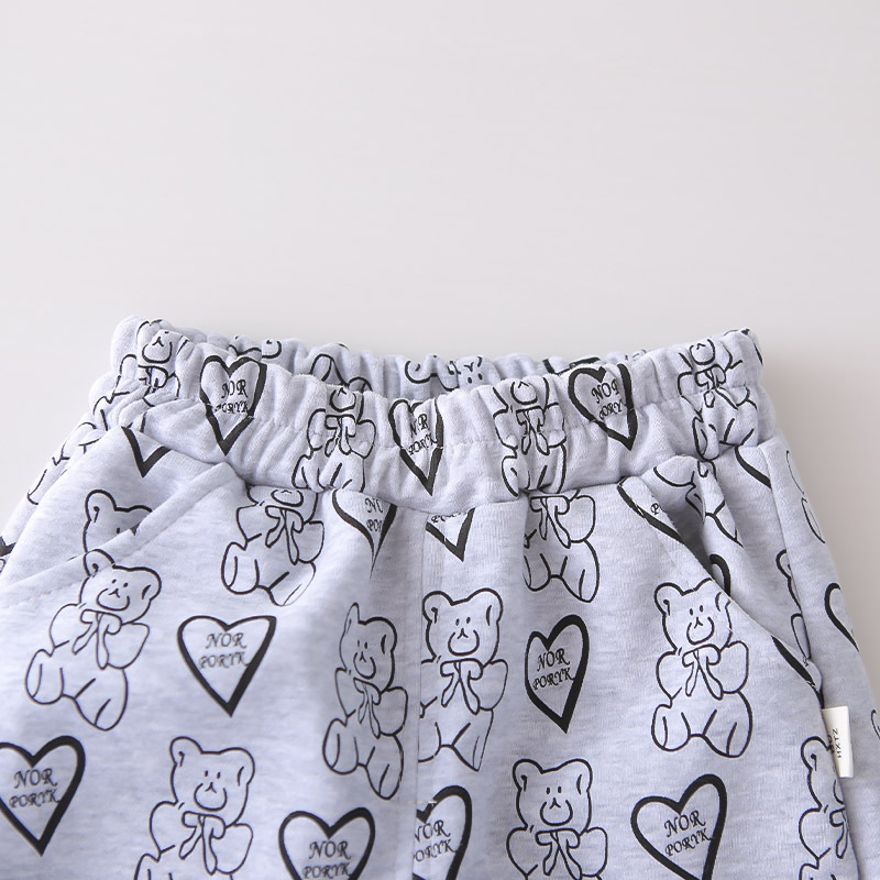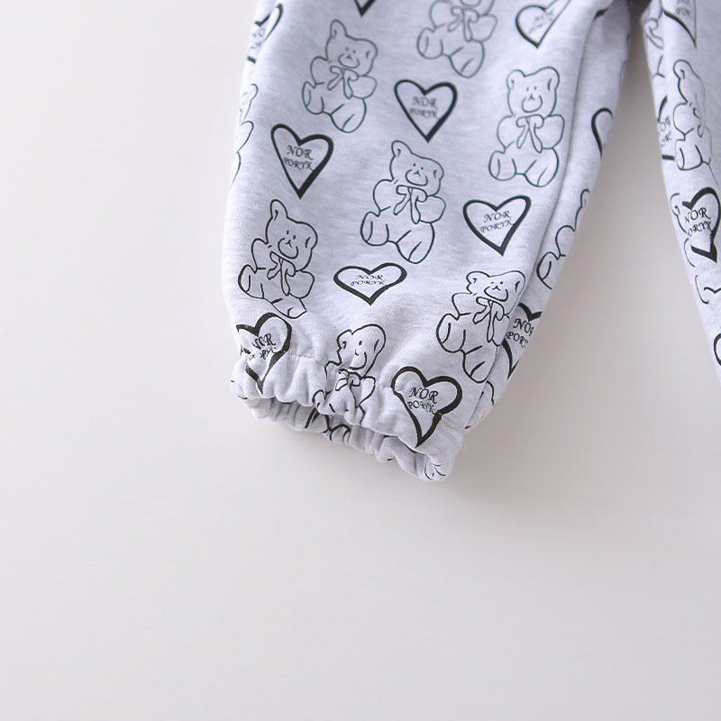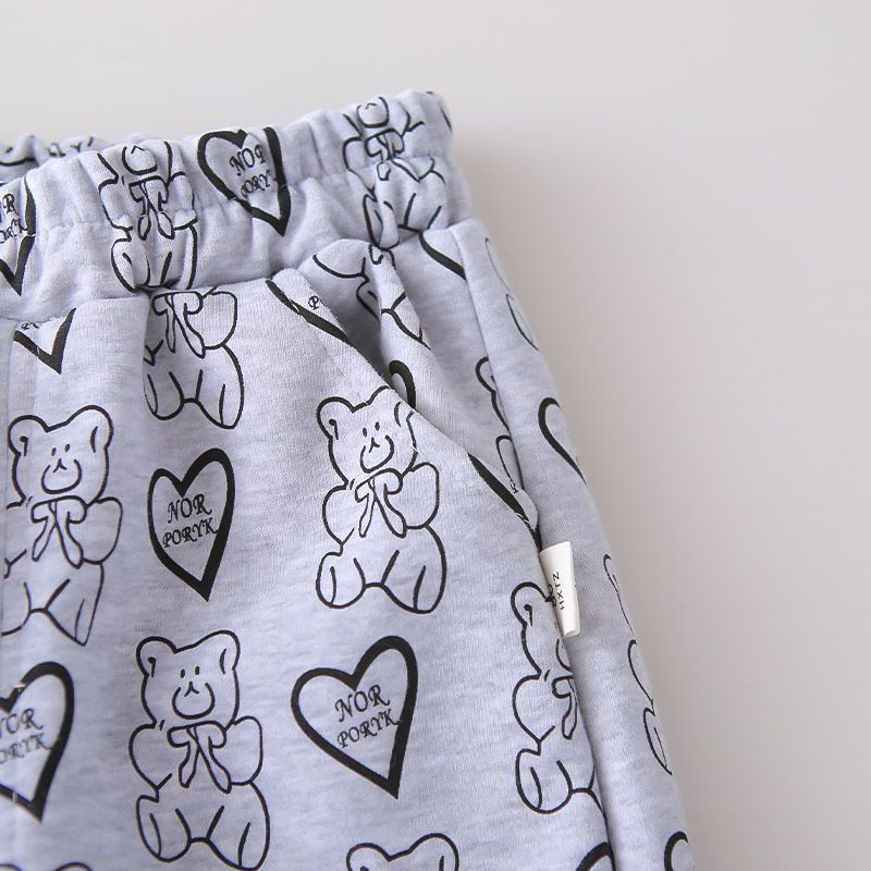 -Pantalon cu talie și tiv elastic, cu imprimeu repetitiv cu ursuleți. Materialul este moale și elastic, potrivit pentru joacă și mișcare. Manșetele de la baza cracilor asigură stabilitate și un aspect modern.