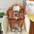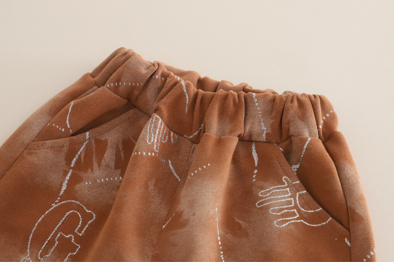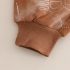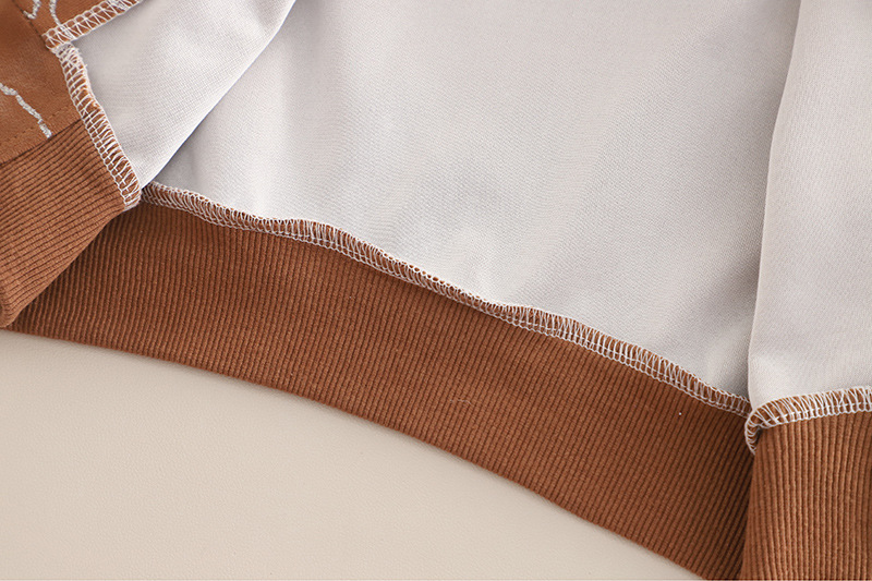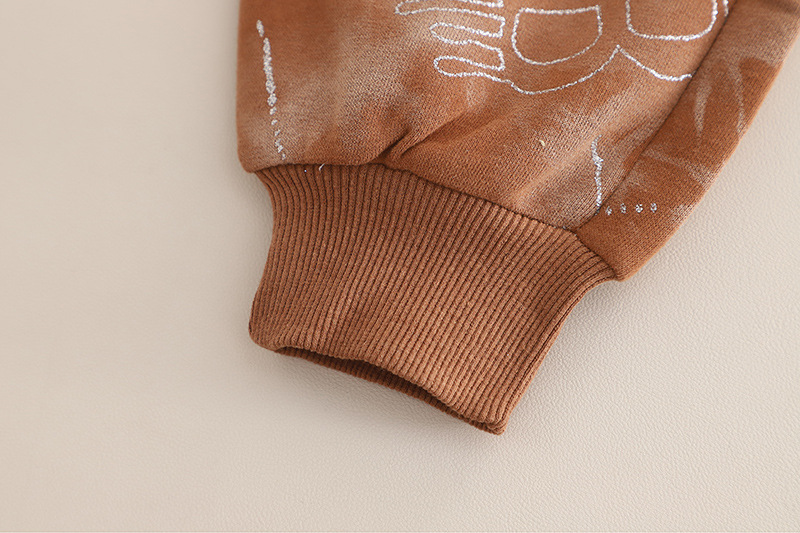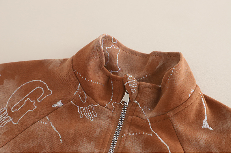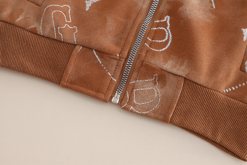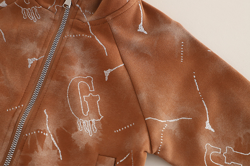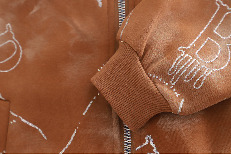 – Hanorac cu fermoar, într-o nuanță cărămizie-maro, confecționat din bumbac moale cu efect marmorat. Decorat cu imprimeuri contrastante de litere și motive urbane. Croială lejeră, cu manșete elastice la mânecите și tivul de jos.
