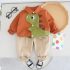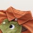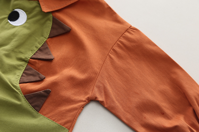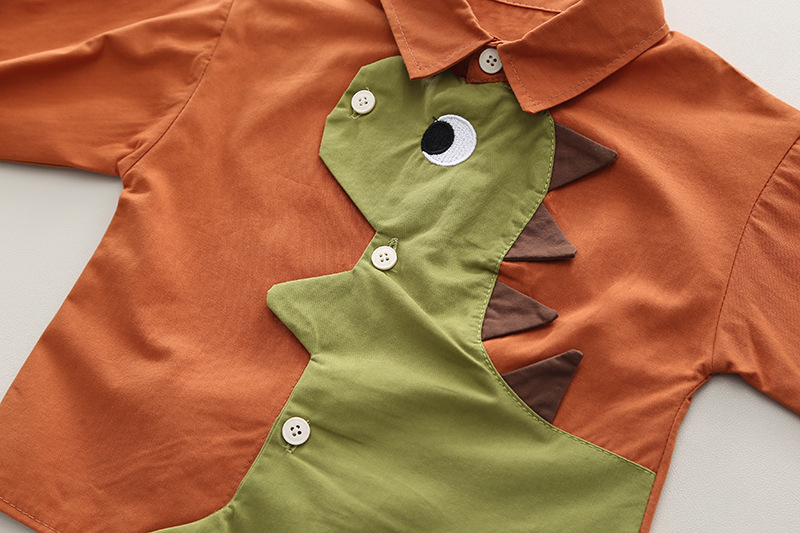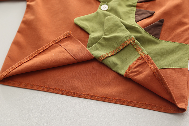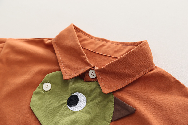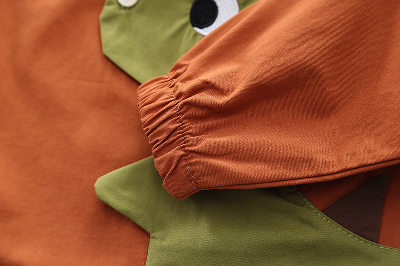 -Cămașă din bumbac, într‑o nuanță intensă de chihlimbar‑portocaliu. Model cu guler clasic și închidere cu nasturi. Decorată cu o aplicație 3D mare de dinozaur, în verde proaspăt, completată de „spini” textili volumetrici. Sunt adăugate manșete elastice la încheieturi, care asigură o potrivire confortabilă.