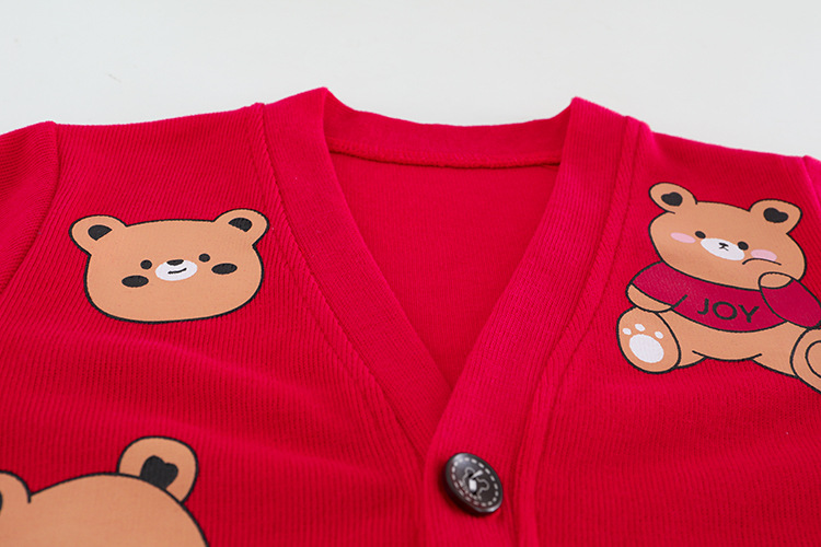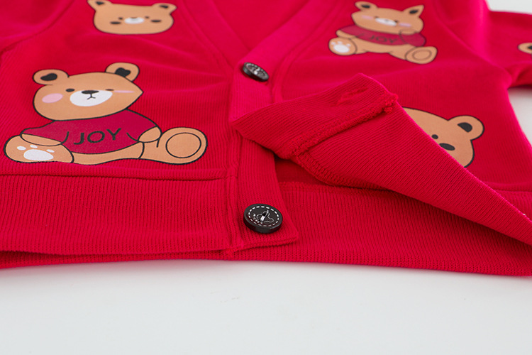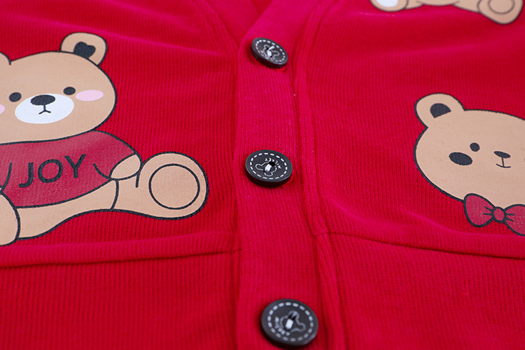 – Cardigan roșu din tricotaj fin de înaltă calitate, cu un imprimeu modern cu ursuleți. Model cu decolteu în formă de „V” și nasturi.