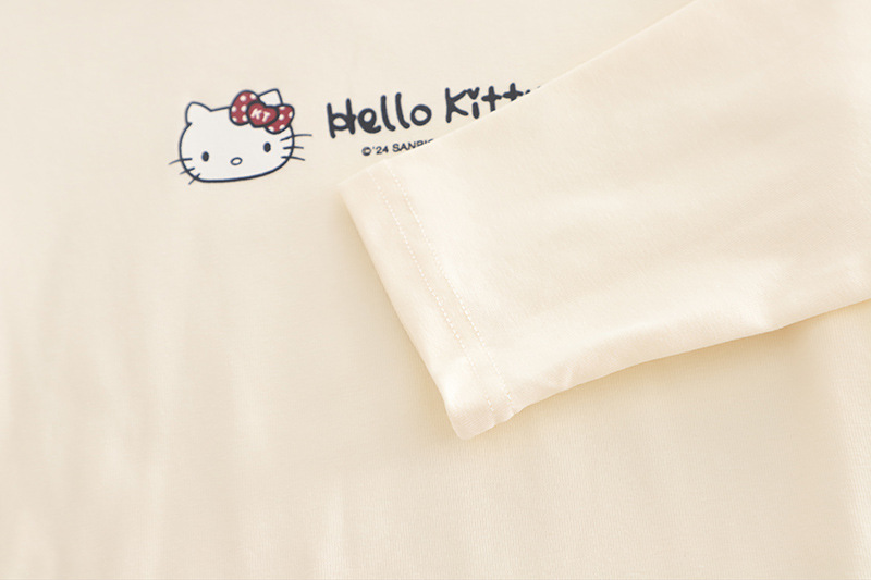 -Bluză în nuanță vanilie, cu decolteu rotund și imprimeu cu Hello Kitty – pentru un accent grafic delicat. Detaliul de efect al modelului este dantela fină aplicată la bază.