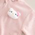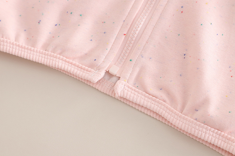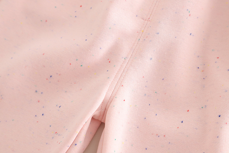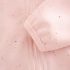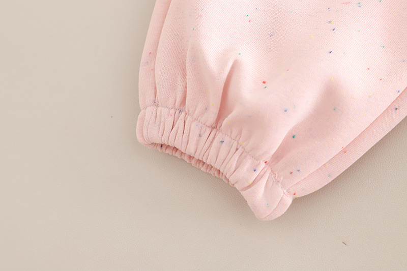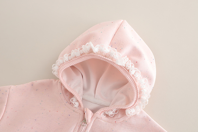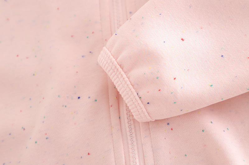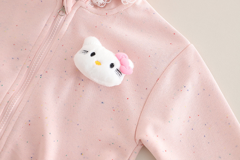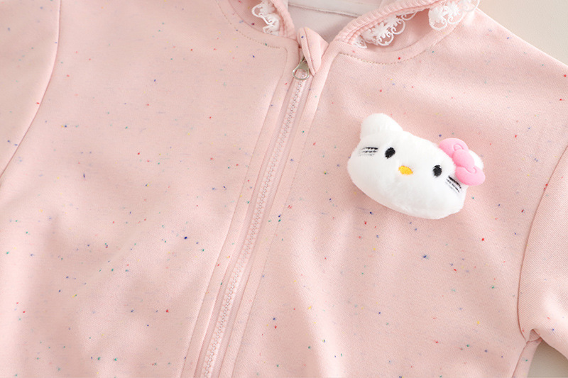 -Hanorac confecționat din bumbac roz deschis, cu stropi colorați „melanj” (în albastru, galben, roșu și verde). Model cu glugă, decorat cu dantelă brodată și un element 3D „pisicuță”. Se închide cu fermoar + manșete elastice pentru confort la purtare.