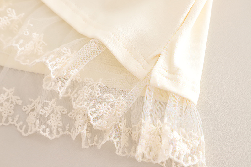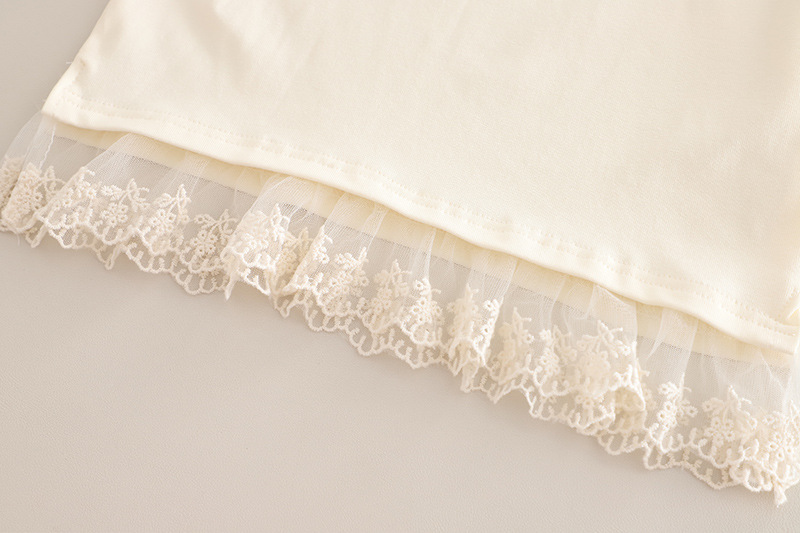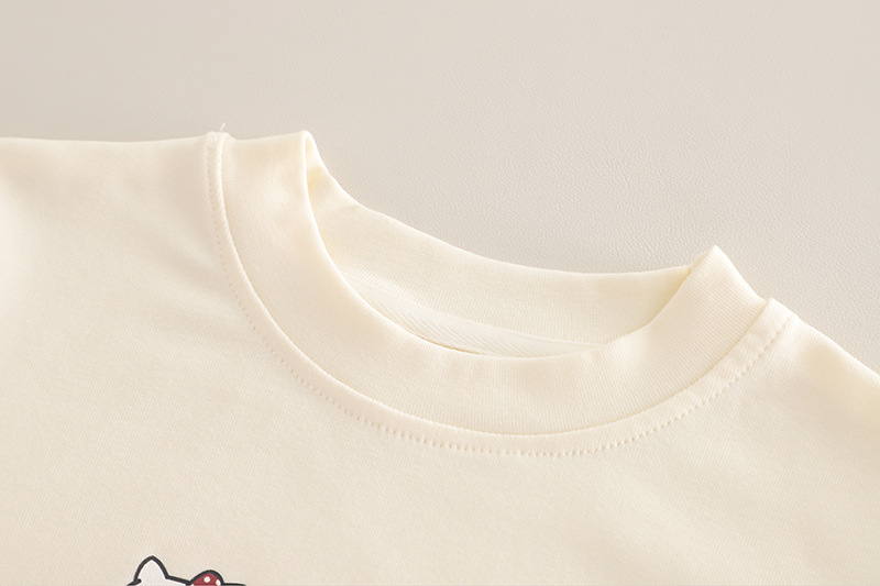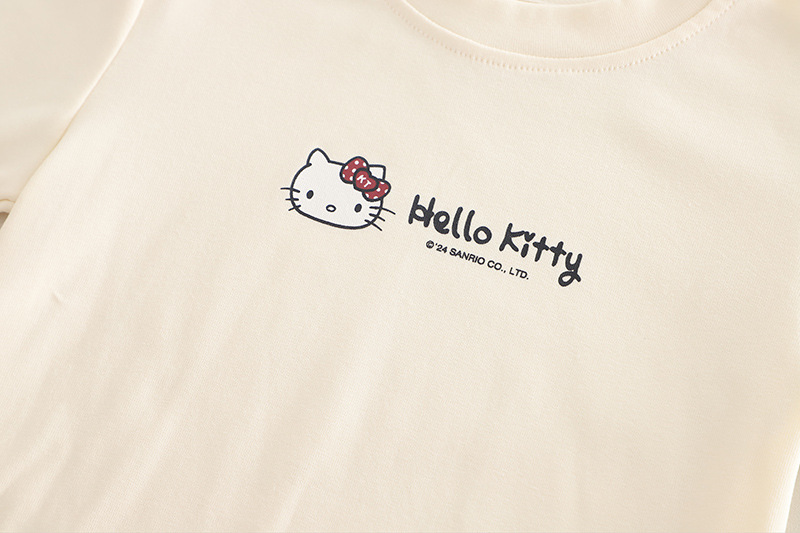 -Bluză în nuanță vanilie, cu decolteu rotund și imprimeu cu Hello Kitty – pentru un accent grafic delicat. Detaliul de efect este dantela fină aplicată la tiv.