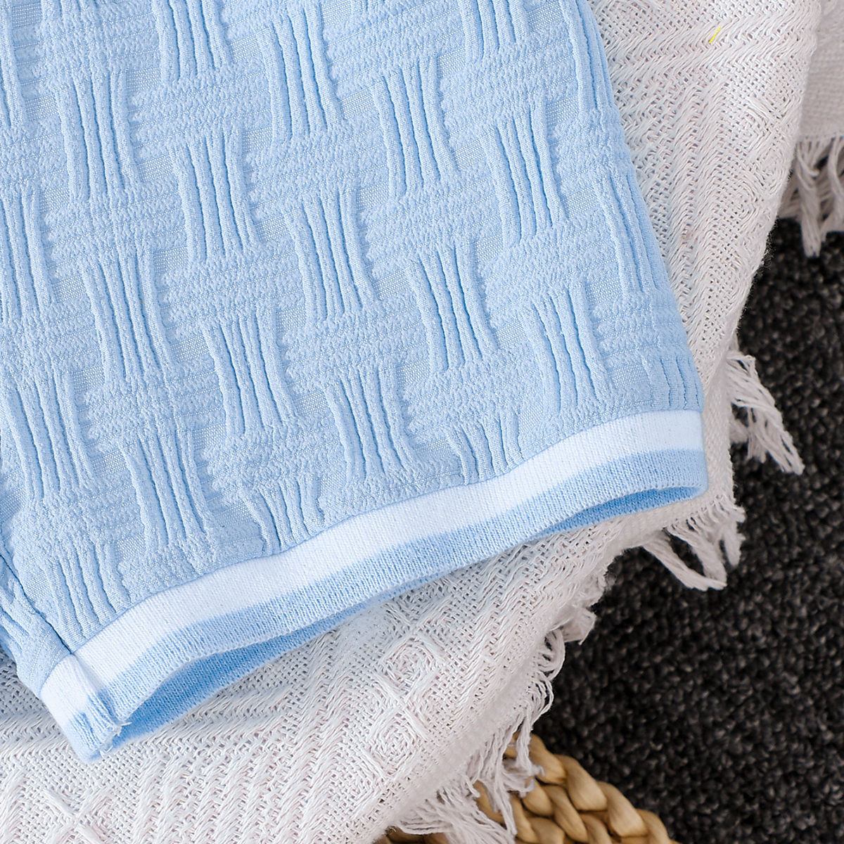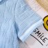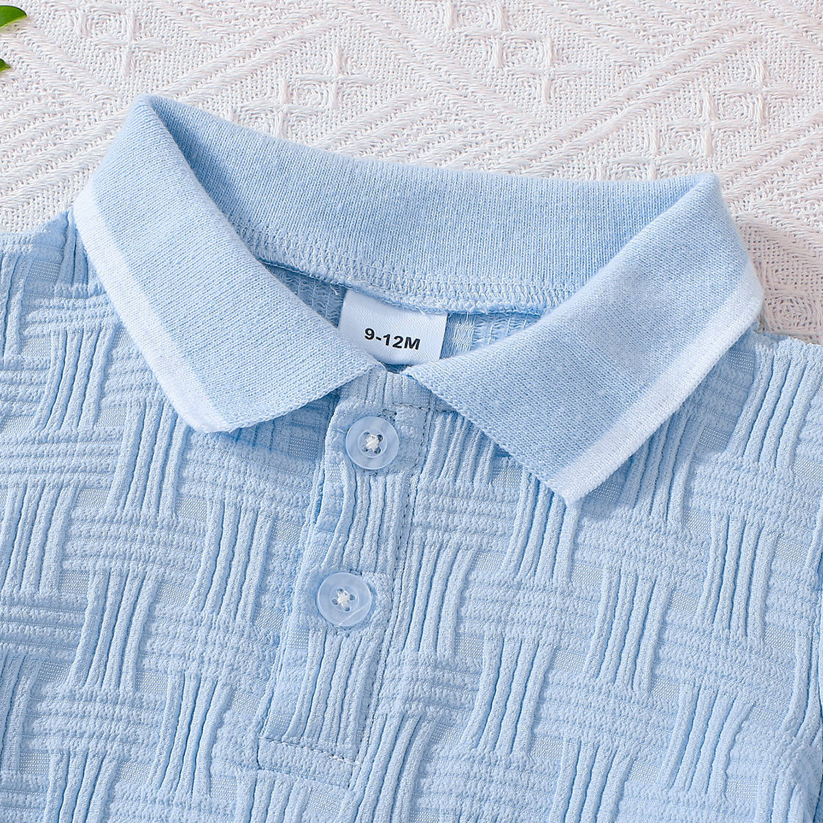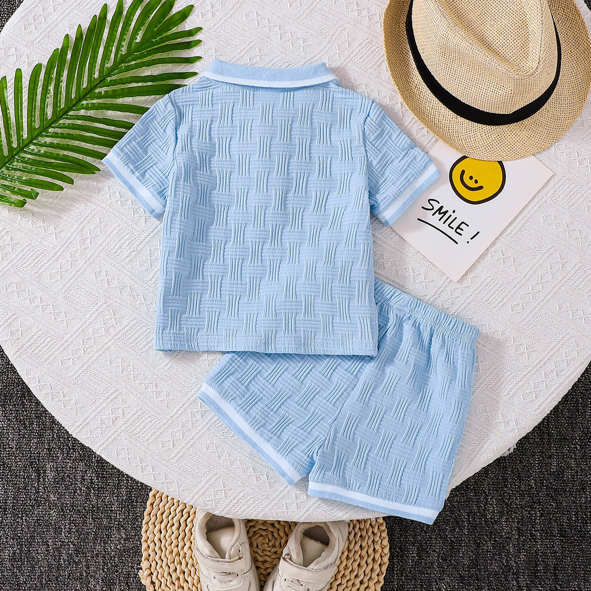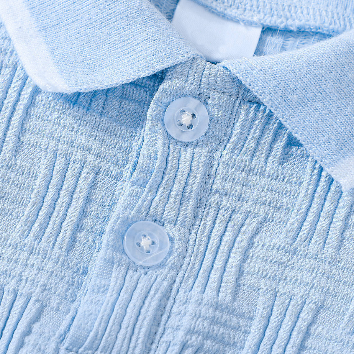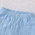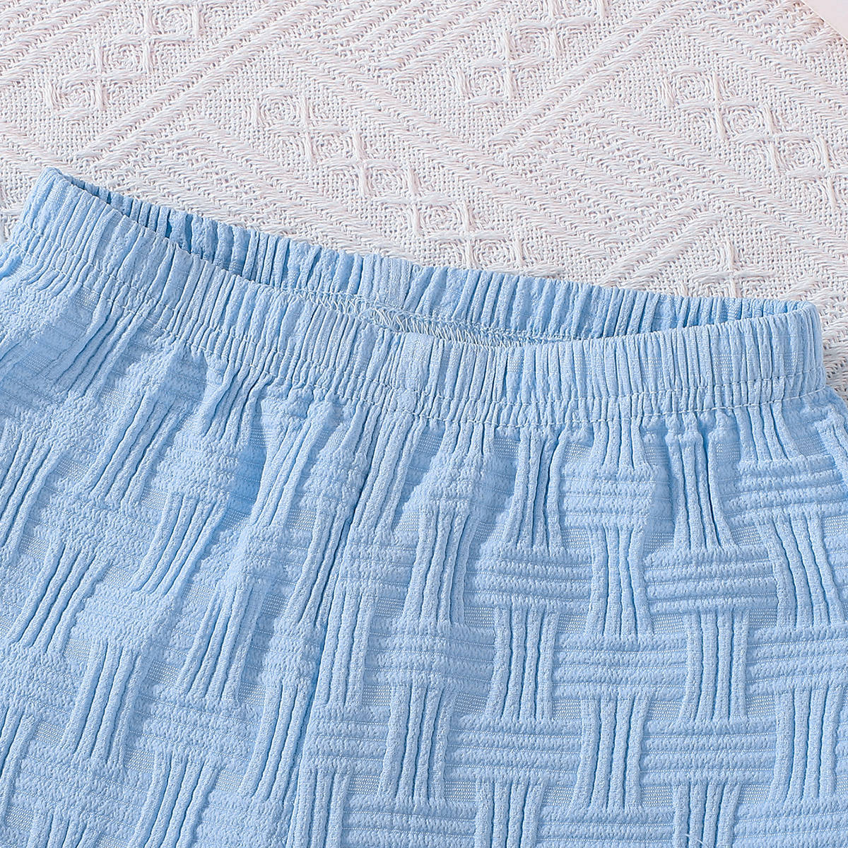 – Pantalon scurt în aceeași nuanță de albastru deschis, realizat dintr-un material ușor și plăcut la atingere, cu structură în relief. Modelul are talie elastică pentru îmbrăcare ușoară și libertate de mișcare. Croiala este comodă și potrivită pentru joacă activă și plimbări.