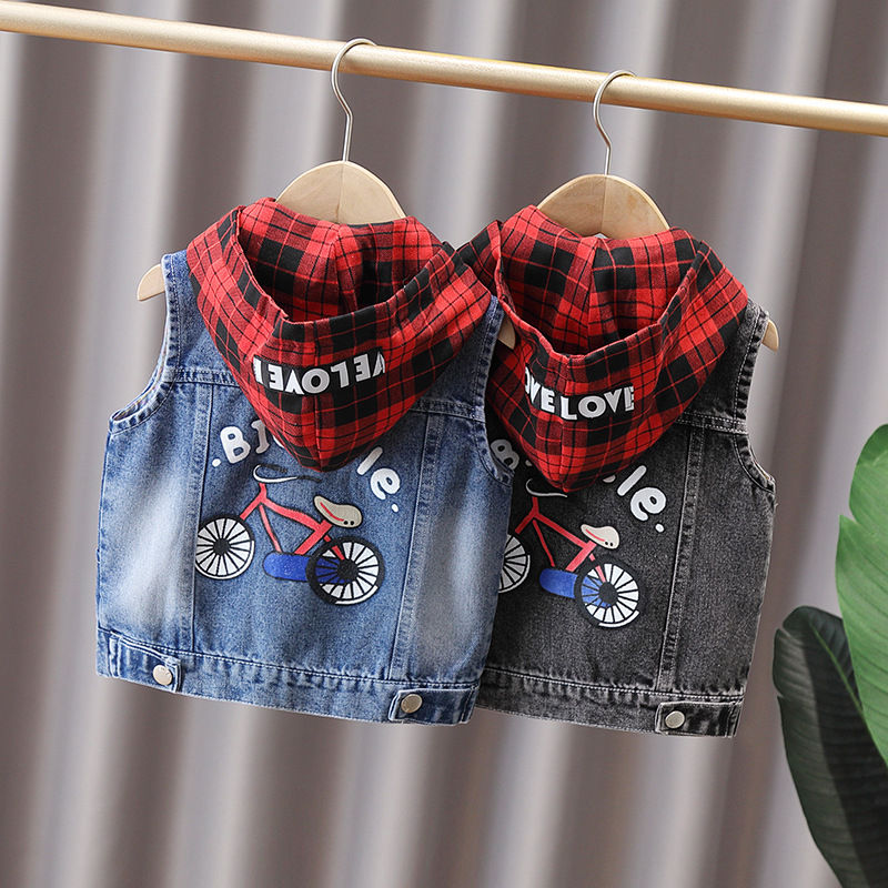 Vestă din denim cu glugă în carouri, guler clasic și imprimeu pe spate Rocky Mood Black Bicycle