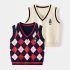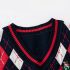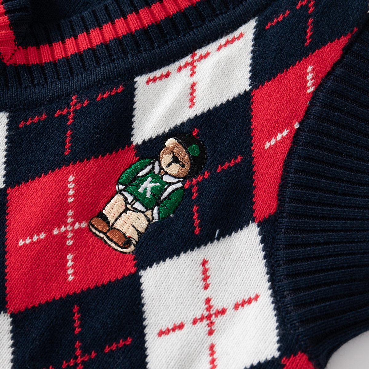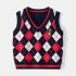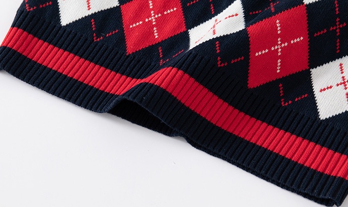 😎 Modelul este disponibil în două variante rafinate – crem cu tivuri contrastante și bleumarin cu model romboidal (argyle) în roșu și alb.